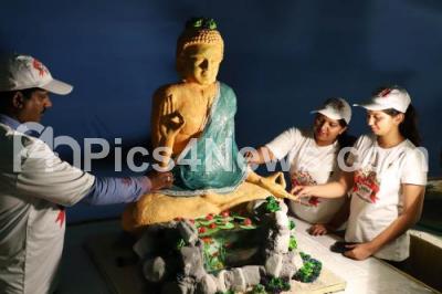 Photo Caption : Cake artistes giving final touch to the “Buddha†cake, during the press conference of the 44th Annual cake show at St Josephs Indian high school grounds, in Bengaluru on Thursday 13th December 2018