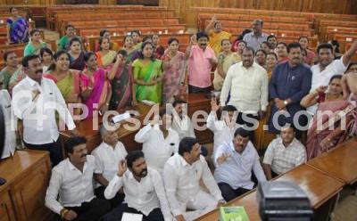 Photo Caption : BJP councilors seen protesting during the BBMP standing committee elections at BBMP Head Office, in Bengaluru on Friday 14th December 2018