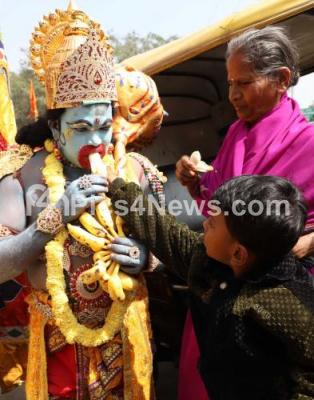 Photo Caption : A child feeding banana to devotees dressed in Lord Hanuman attire, celebrating Hanuman Jayanti, at Anand Rao Circle, in Bengaluru on Thursday 20th December 2018