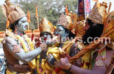 Photo Caption : Devotee dressed like lord Rama seen feeding banana to devotees dressed in Lord Hanuman attire, celebrating Hanuman Jayanti, at Anand Rao Circle, in Bengaluru on Thursday 20th December 2018