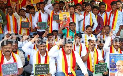 Photo Caption : Members of Karnataka Ranadheera Pade protesting against the state govt for English Medium coaching in Government Primary Schools, in Bengaluru on Saturday 22nd December 2018