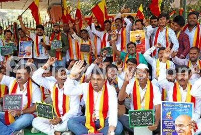 Photo Caption : Members of Karnataka Ranadheera Pade protesting against the state govt for English Medium coaching in Government Primary Schools, in Bengaluru on Saturday 22nd December 2018