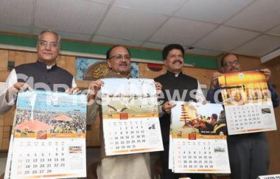 Sidharth Nath Singh, Health Minister of Government of Uttar Pradesh with BJP MLC Lehar Singh and Jacob Crasta releasing calendar during a press conference at Press Club about Kumbh Mela, in Bengaluru on Wednesday 26th December 2018