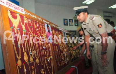 Photo Caption : Police personnel inspects the recovered jewels which were seized by KP Agrahara police from the accused during a press conference at Commissioner of Police office, in Bengaluru on Wednesday 26th December 2018