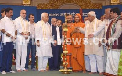Photo Caption : Sri Ragaveshwara Bharati Swamiji, Sri Vidyaprasannatheerta Swamiji, Minister RV Deshpande, MLAs HK Patil, Halappa, Former Minister PGR Sindhiya and others during inauguration of Platinum jubilee celebration and Vishwa Havyaka Sammelana (World Quarterly Conference) organised by Akila Havyaka Mahasba at Palace Grounds, in Bengaluru on Friday 28th December 2018