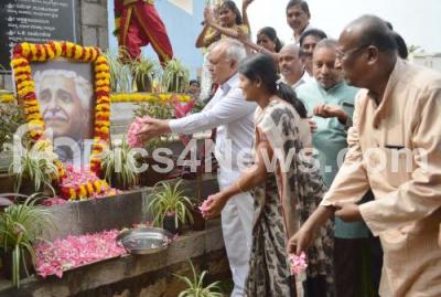 Photo Caption : MLA Ramalinga Reddy with Mayor Gangambike Mallikarjuna, Wrtiter Jaraganahalli Shivashankar and others paid tribute to Rashtrakavi Kuvempu, on his 115th birth anniversary celebration program at Freedom Park, in Bengaluru on Saturday 29th December 2018