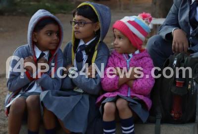 Photo Caption : Young students seen bearing the cold weather in the early morning, as the cold wave like weather struck Bengaluru city with temperatures souring low, in Bengaluru on Thursday 3rd January 2019