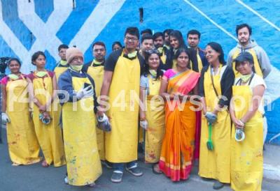 Photo Caption : Mayor Nagambike Mallikarjuna and volunteers participated in wall painting program at Windsor Manor under pass, in Bengaluru on Sunday 6th January 2019