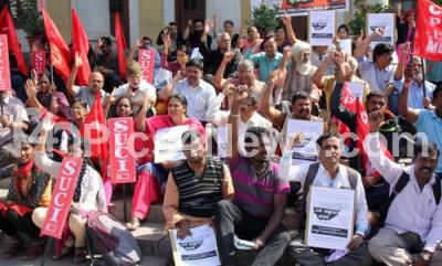 Photo Caption : Members of CPI, CPIM, SUCI protesting to fulfill their various demands at Town Hall, in Bengaluru on Sunday 6th January 2019