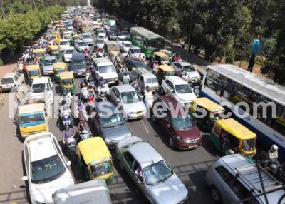 Photo Caption : Traffic Jam at corporation Circle due to various organisations protest rally during a 2 day nationwide strike called by central trade unions in protest against the anti people policies of the Central Government, in Bengaluru on Tuesday 8th January 2019
