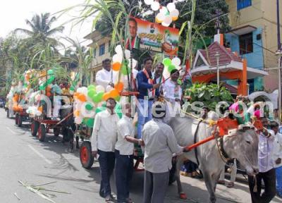 Photo Caption : Congress leaders and workers riding bullock cart during Sankranti celebrations organised by Bengaluru Youth Congress at Okalipuram, in Bengaluru on Tuesday 15th January 2019