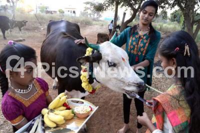 Girls offering pooja to the cattle on the occasion of Sankranti Festival at Kengeri, in Bengaluru on Tuesday 15th January 2019