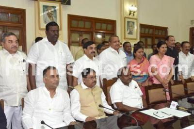 Event Description : CM HD Kumarswamy, DCM Dr G Parameshwara and MLA Dinesh Gundu Rao and newly elected parliamentary secretaries Abdul Jabbar, Dr Anjali Hemant Nimbalkar, Ivan D Souza and Kaujalagi Mahalinga Shivananda Roopa Shashidhar, Govindraj, Ragavendra Basavaraj Hitnal and DS Holageri during oath taking ceremony at Conference Hall, Vidhana Soudha, in Bengaluru on Thursday 17th January 2019