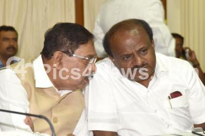 Photo Caption : CM HD Kumarswamy discussing with DCM Dr G Parameshwara during newly elected parliamentary secretaries oath taking ceremony at Conference Hall, Vidhana Soudha, in Bengaluru on Thursday 17th January 2019