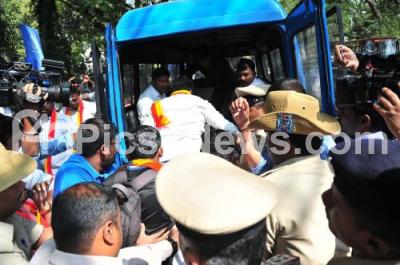 Photo Caption : Kannada organisations staged a protest for conducting the “Quest Equity, Conversations of the Constitution†Interactive Conference at Hotel Lalit Ashok, on the day when the Karnataka state is mourning the death of Dr Shri Shivakumar Swamiji, Siddaganga Mut, the activists demanded to stop the program and were taken into preventive custody by police, in Bengaluru on Tuesday 22nd January 2019