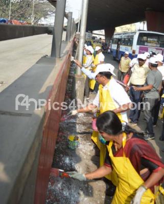 Photo Caption : Mayor Gangambike Mallikarjun painted on the Flyover pillars at KR Market, as part of Swachh Survekshan 2019 program, in Bengaluru on Sunday 27th January 2019