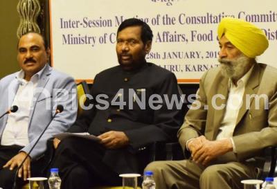 Event Description : Union Consumer Affairs, Food and Public Distribution Minister Ram Vilas Paswan with Balwinder Singh, Member of Rajya Sabha and Rajesh Kumar Diwakar, Member of Lok Sabha addressing a press conference at the Interactive session meeting of the ministry Consultative Committee at Hotel Shangri La, in Bengaluru on Monday 28th January 2019