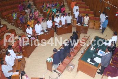 Photo Caption : BBMP Mayor Gangambike Mallikarjuna, Deputy Mayor Bhadregowda, BBMP Commissioner Manjunath Prasad and Councilors paying homage to Dr Shivakumar Swamiji and Former Union Minister George Fernandes during BBMP council meeting at BBMP, in Bengaluru on Tuesday 29th January 2019