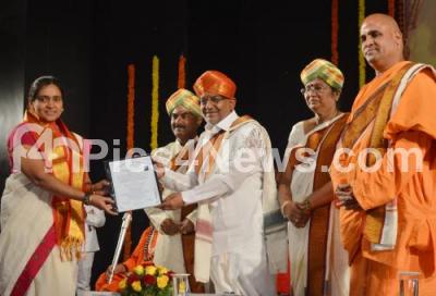 Event Description : Minister GT Devegowda with Sri Veereshananda Saraswathi Swamy, Sri Nalwadi Shantalinga Shivacharya Mahaswamy, Prof Padma Shekhar, Vice Chancellor Karnataka Samskrit University and others presenting degree certificates to students during the 7th Annual Convocation of Karnataka Samskrit University at Ravindra Kalakshetra, in Bengaluru on Thursday 31st January 2019