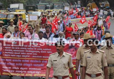 Photo Caption : Members of TOKAI RIKA MINDA Employees Union, affiliated to CITU, participated in a protest rally to fulfill their various demands from Town Hall to SBM Circle, in Bengaluru on Tuesday 5thFebruary 2019
