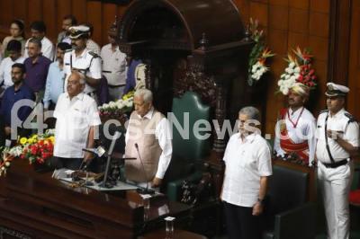 Photo Caption : Governor of Karnataka Vajubhai Vala with speaker Ramesh Kumar and Council Chairman Pratap Chandra Shetty during joint session at Vidhana Soudha, in Bengaluru on Wednesday 6th February 2019