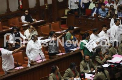 Photo Caption : Congress Ministers Zameer Ahmed Khan, Jayamala and others arguing with the protesting BJP MLCs during the Council Session at Vidhana Soudha, in Bengaluru on Thursday 7th February 2019