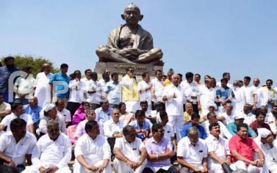 BJP MLAs protesting in front of Mahatma Gandhi Statue at Vidhana Soudha after they boycotted the budget session, in Bengaluru on Friday 8th February 2019