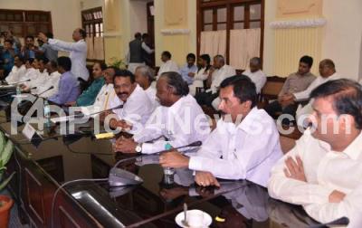Photo Caption : CLP Leader Siddaramaiah, DCM Dr G Parameshwara, Minister DK Shivakumar, KPCC President Dinesh Gundu Rao and MLAs, MLCs during a CLP meeting at Vidhana Soudha, in Bengaluru on Friday 8th February 2019