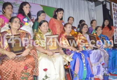 Playback Singer Nadoja Dr BK Sumitra, Actress Dr RT Rama, Actress Pramila Josai, Dr KR Sandya Reddy and Dancer Usha Daatar being felicitated during 5th year Mahila Kalvidara Sammelana (Women Artistes Conference) of Manini Kala Kuta organised by Sangeeta Ganga at Kondajji Basappa Auditorium, also seen are Former Minister Rani Satish, MLA Sowmya Reddy, Sri Lakshmi, Senior Actress Rama Arvind, Savita KP, R Lakshmi and Manini Kala Kuta Members, in Bengaluru on Saturday 9th February 2019
