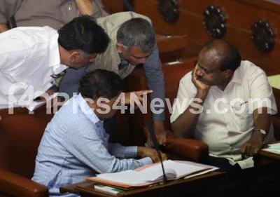 Photo Caption : CM HD Kumarswamy in discussion with DCM Dr G Parameshwar and Ministers Krishna Byre Gowda and DK Shivakumar during the discussion on audiogate controversy at the Assembly Session at Vidhana Soudha, in Bengaluru on Monday 11th February 2019