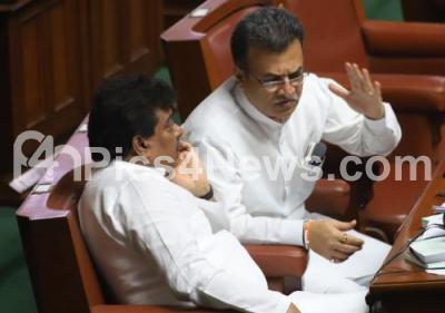 Photo Caption : Congress MLA Mahesh Kumatahalli in conversation with Home Minister MB Patil during the discussion on audiotape controversy during the Assembly Session at Vidhana Soudha, in Bengaluru on Wednesday 13th February 2019