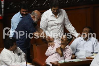 Photo Caption : MLA Ramesh Jarkiholi seen with other MLAs during the discussion on audiotape controversy during the Assembly Session at Vidhana Soudha, in Bengaluru on Wednesday 13th February 2019