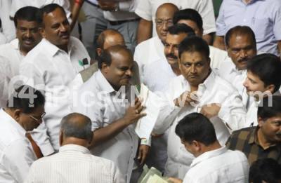 Photo Caption : CM HD Kumarswamy interacting with Ministers and MLAs during the discussion on audiotape controversy during the Assembly Session at Vidhana Soudha, in Bengaluru on Thursday 14th February 2019