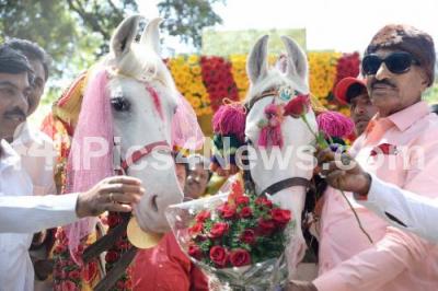 Members of Kannada Chaluvali Vatal Paksha led by its President Vatal Nagaraj conducting horses marriage in support of Valentines Day at Cubbon Park, in Bengaluru on Thursday 14th February 2019