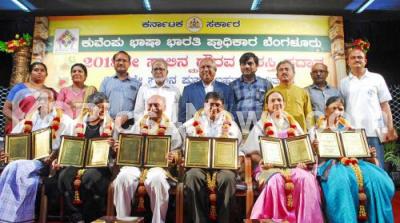 Photo Caption : Justice HN Nagamohan Das, Retd Judge of High Court of Karnataka presenting "Honorary and Book" award 2019 during program organised by Kuvempu Bhasha Bharati Pradikara at Kannada Bhavan, also seen KM Janaki, Director, Kannada and Cultural Dept, Dr K Marulasiddappa, President, Kuvempu Bhasha Bharati Pradikara and others, in Bengaluru on Friday 15th February 2019