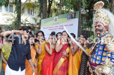 Photo Caption : Students in traditional dresses during "Kannada Nudi Habba" at Maharani Womens Arts, Commerce and Management College, in Bengaluru on Friday 15th February 2019