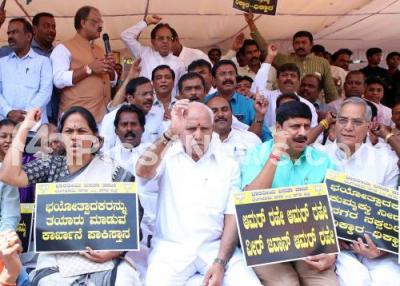 Photo Caption : BJP Leaders and Workers led by BJP State President BS Yeddyurappa staged a protest against the Pulwama Terrorist Attack, the protest washeld at Gandhi Statue, Anand Rao Circle, in Bengaluru on Sunday 17th February 2019