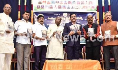 Photo Caption : Jaraganahalli Shivashankar with Mayanna, Siddarju and others releasing the book “Agrasaligeâ€, authored by Kakolu M Shailesh at Kannada Sahitya Parishat, in Bengaluru on Sunday 17th February 2019