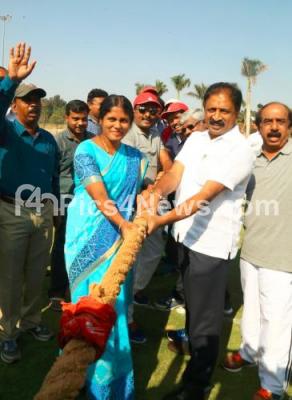 Event Description : Mayor Gangambike Mallikarjuna with Deputy Mayor Bhadregowda and Councilors playing tug of war during inauguration of Mayor Cup Cricket tournament at PES college, in Bengaluru on Sunday 17th February 2019