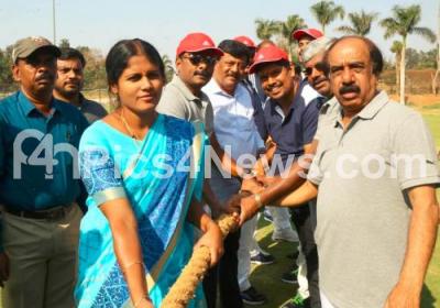 Mayor Gangambike Mallikarjuna with Deputy Mayor Bhadregowda and Councilors playing tug of war during inauguration of Mayor Cup Cricket tournament at PES college, in Bengaluru on Sunday 17th February 2019