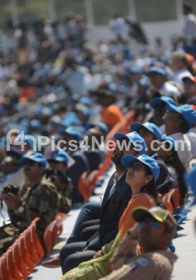 Invitees watch a flying display on the inaugural day of Aero India 2019 at Yelahanka air base, in Bengaluru on Wednesday 20th February 2019