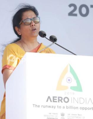 Photo Caption : Indian Defense Minister Nirmala Sitharaman addressing the inaugural day of Aero India 2019 at Yelahanka air base, in Bengaluru on Wednesday 20th February 2019