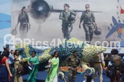 Photo Caption : Family members of Indian Air force personnel pose next to a floral aircraft model on the inaugural day of Aero India 2019 at Yelahanka air base, in Bengaluru on Wednesday 20th February 2019