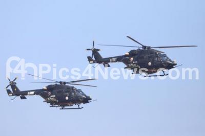 Photo Caption : LCH helicopters performing aerobatic maneuvers on the inaugural day of Aero India 2019 at Yelahanka air base, in Bengaluru on Wednesday 20th February 2019
