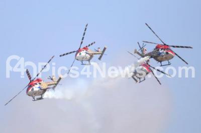 Photo Caption : Sarang helicopters performing aerobatic maneuvers on the inaugural day of Aero India 2019 at Yelahanka air base, in Bengaluru on Wednesday 20th February 2019