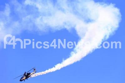 Photo Caption : LCH helicopters performing aerobatic maneuvers on the third day of Aero India 2019 at Yelahanka air base , in Bengaluru on Saturday 22nd February 2019