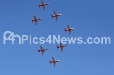 Photo Caption : Surya Kiran display perform aerobatic maneuvers on the 4th day of Aero India 2019 at Yelahanka air base, in Bengaluru on Saturday 23rd February 2019
