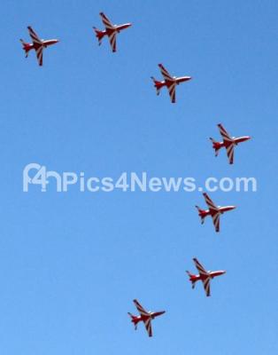 Photo Caption : Surya Kiran display perform aerobatic maneuvers on the 4th day of Aero India 2019 at Yelahanka air base, in Bengaluru on Saturday 23rd February 2019