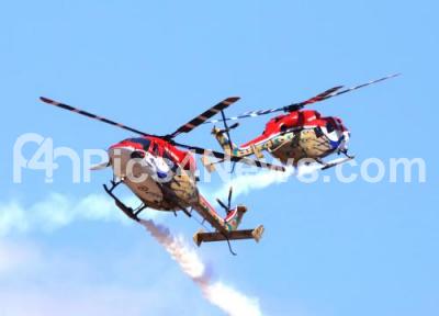 Photo Caption : Sarang helicopters performing aerobatic maneuvers on the 4th day of Aero India 2019 at Yelahanka air base, in Bengaluru on Saturday 23rd February 2019