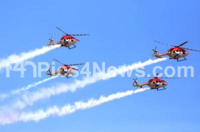 Sarang helicopters performing aerobatic maneuvers on the 4th day of Aero India 2019 at Yelahanka air base, in Bengaluru on Saturday 23rd February 2019